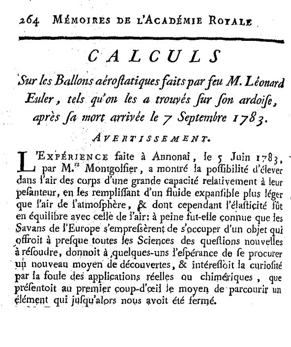 M. Euler ne put être instruit que peu de temps avant sa mort de la découverte de M. Montgolfier. L’idée de chercher les lois du mouvement vertical d’un globe qui s’élève dans un air calme, en vertu de la force ascensionnelle qu’il doit à sa légèreté, a été la première qui se soit présentée à son esprit : il essaya sur-le-champ d’appliquer le calcul à cette question ; et lorsqu’il fut surpris par la mort, la planche noire sur laquelle il écrivait avec de la craie, depuis qu’il était presque privé de la vue, était chargée de ces calculs, les derniers qui aient été faits par ce grand homme, aussi singulier peut-être par le nombre incroyable de ses travaux, que par la profondeur et la force de son génie. (cité par Barilier, 2018)
