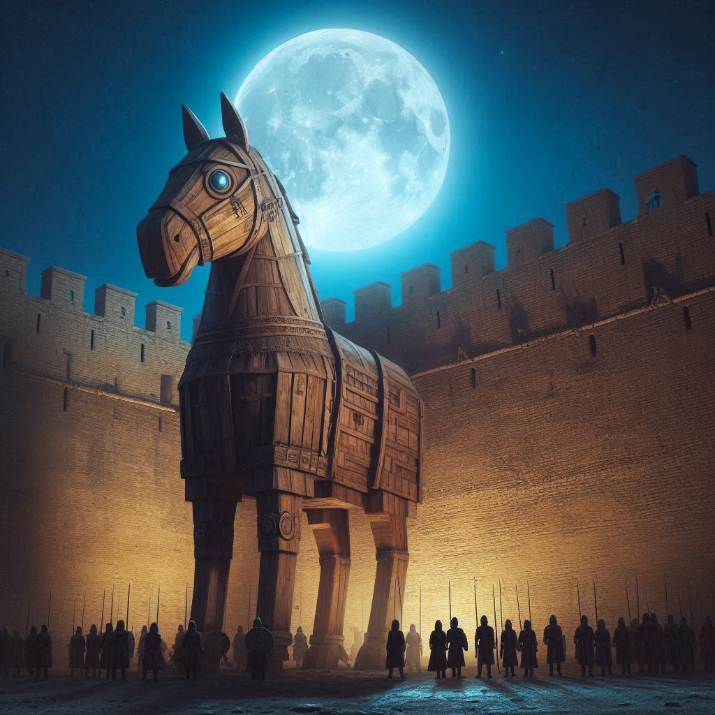 Voyant cela, les Troyens, prudents, se dirigent vers les rivages et voient qu’il n’y a plus personne. Ils voient aussi le cheval et sont frappés d’étonnement puisque le seul Achéen qui reste est Sinon, qui leur explique que les Achéens fuient lassés de la guerre et qu’ils laissent un cheval en l’honneur de Tritogénie. Il leur fait croire également que sur conseil d’Ulysse, il devait être sacrifié et qu’il a préféré fuir. Un Troyen, Laocoon, n’est pas dupe de la ruse mais cela met Tritogénie en colère qui s’en prend à lui.