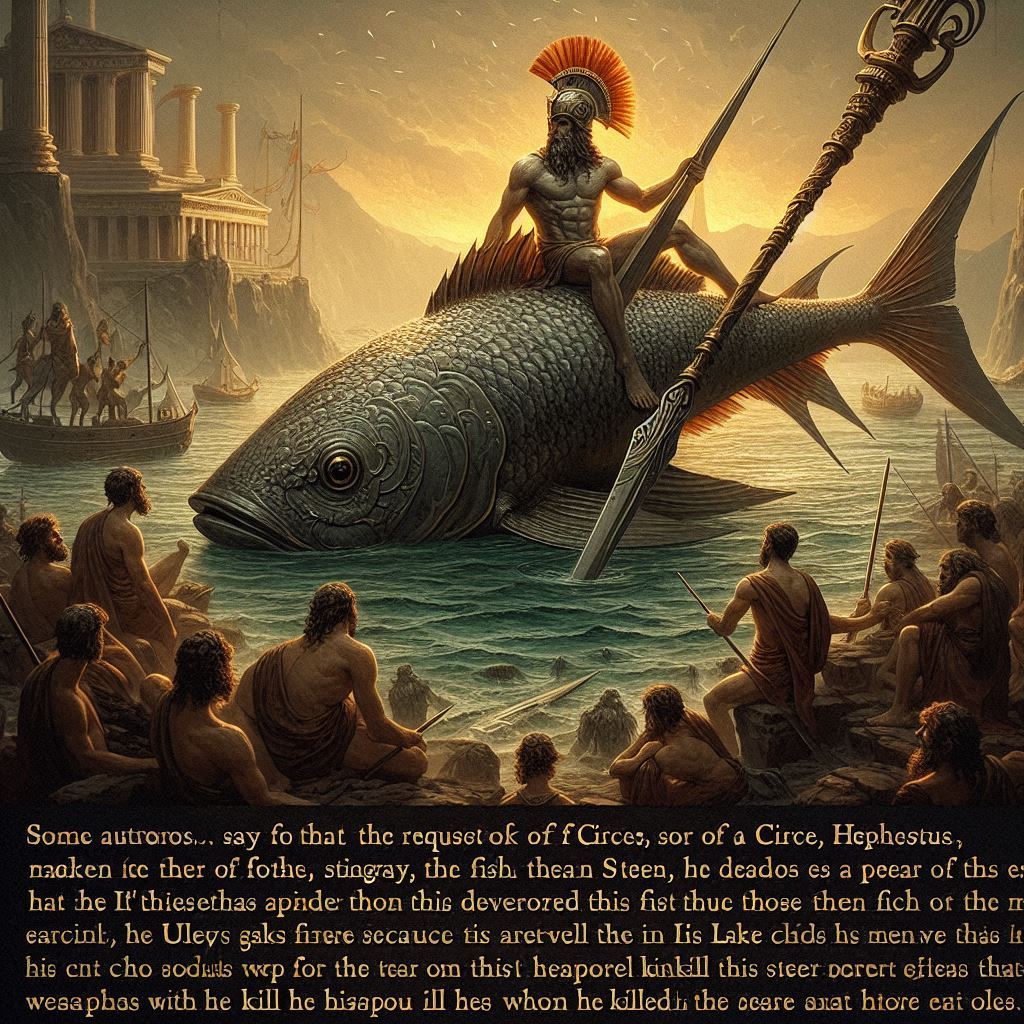 Quelques auteurs… disent qu’à la demande de Circé, Héphaïstos fabriqua pour Télégonos une lance avec un dard de pastenague, ce poisson que Phorkys avait tué parce qu’il dévorait ceux de son lac. Le bout de cette lance était d’acier et sa pointe, d’or : c’est avec cette arme qu’il tua Ulysse. Les poètes postérieurs ont inventé l’histoire de Télégonos, fils de Circé et d’Ulysse, censé partir à la recherche de son père, arriver à Ithaque, puis tuer son père qu’il ne connaissait pas, avec un dard de pastenague (p. 1063).